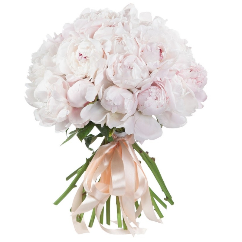 Букет состоит из 51 белый пион, прозрачная упаковка, атласная лента.
