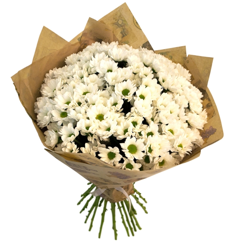 Букет состоит из 25 веток белой ромашковой хризантемы, крафт, атласная лента.