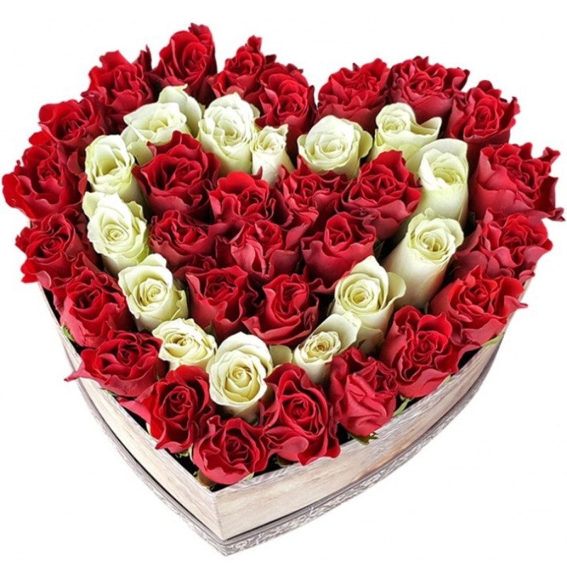 Композиция "Сердце" из 45 красных и белых роз в коробке