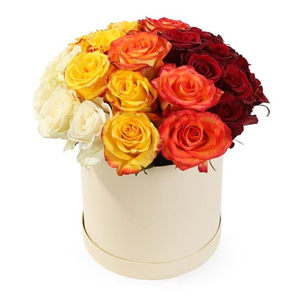 Букет состоит из 25 белых / желтых / оранжевых и красных роз, шляпная коробка.